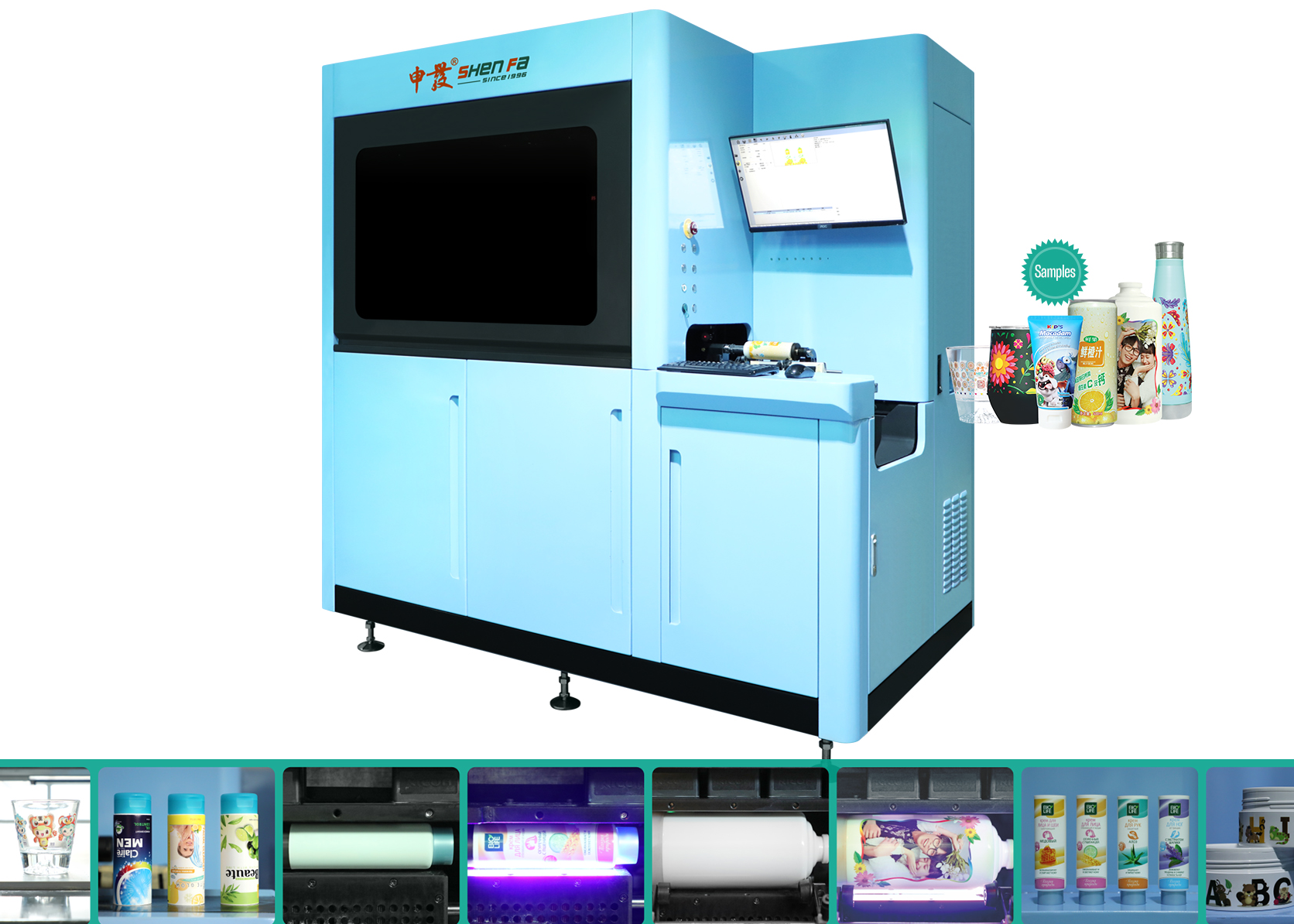 本设备采用600×600dpi,600×900dpi,600×1200dpi三种高分辨率模式,高速螺旋式数码喷墨直印,适用于直径30-150mm,高度≤320mm范围内的圆柱体产品(材质可为金属/塑料/木材/玻璃等),进行快速打印。 锥度打印:待印产品若有锥度,印前无需对印刷图案进行锥度变形处理,打印控制系统自动通过独特算法校正,实现带有锥度产品的完美打印。 无缝衔接:待印产品可实现360°无缝拼接打印精美图案。 夹具更换:一键打印高度智能示教,轻松快速进行不同待印产品相应的夹具更换。 无件不印:打印过程中UV能量检测模块实时动态检测,提前预判因无待印产品/透明产品,导致UV LED光照喷头的风险,并中止当前打印操作。 喷头防撞:打印过程中,激光非接触式&机械接触式防碰撞,双重实时保护打印喷头被意外撞击。 智能LED:根据RS485通讯,可任意控制LED光照待印产品区域、亮度大小。